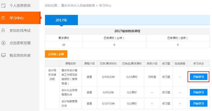 系统自动累计学习时间,根据重庆市会计继续教育要求,学员每年必须完成24学时的内容(必修12学时,选修8学时;另外考试时间为4学时,总计24学时。);