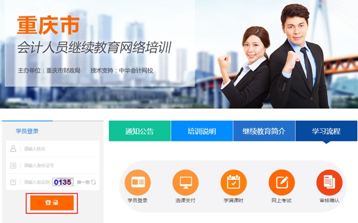 2018重庆会计继续教育网上学习流程 重庆市会计人员继续教育网上学习流程 1、凭个人信息登录: 打开重庆会计继续教育(http://jxjyxuexi.chinaacc.com/chongqing/shi/)后,凭身份证号及姓名登录;登录后请完善个人信息。
