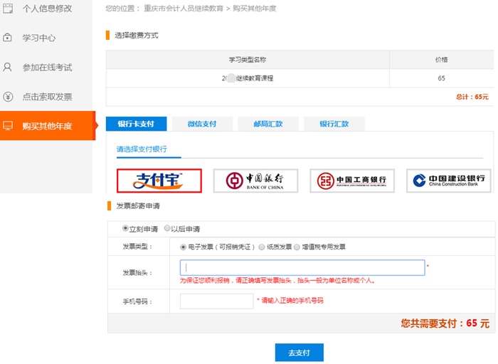 学员需根据自己的继续教育情况选择相应年份及学习类型,并通过网上支付费用开通课程学习;支付宝、微信支付的学员可直接申请发票,邮箱银行汇款学员需支付完成,课程开通后,登录到继续教育个人中心,点击左侧申请发票按钮进行申请。