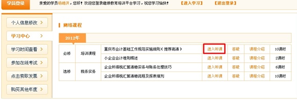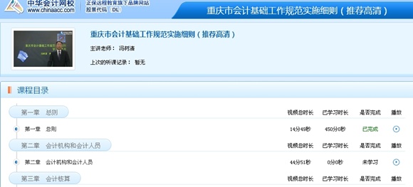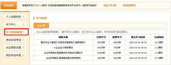 系统自动累计学习时间,根据重庆市会计继续教育要求,学员每年必须完成24学时的内容,具体可点击“学习时间查看 ”进行查询(必修12学时,选修8学时;另外考试时间为4学时,总计24学时。);