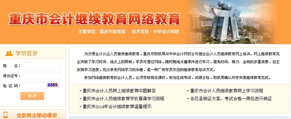 中华会计网校重庆会计继续教育网上学习流程 1、凭个人信息登录: 打开重庆会计继续教育(http://peixun.chinaacc.com/jijiao/chongqing)后,凭身份证号及姓名登录;